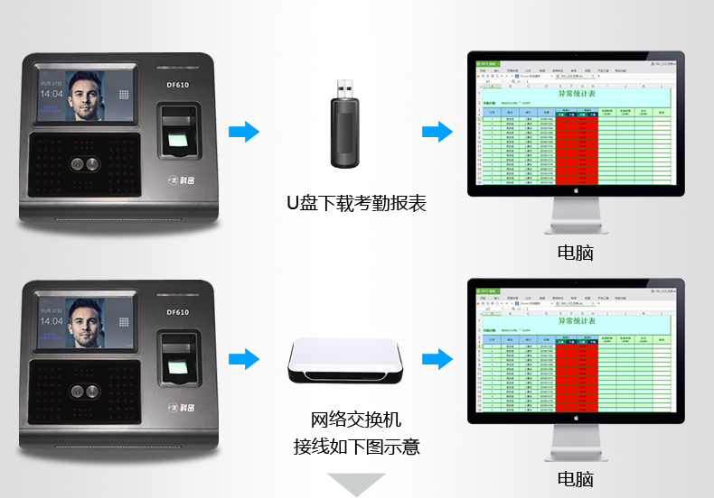 科密DF620/701702人脸考勤机面部识别指纹打卡机网络U盘WIFI下载